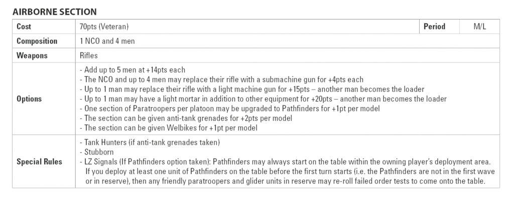 Next, we’ve got a unit that’s been around forever, but with the changes to its composition it’s a whole new beast compared to previous incarnations. The Airborne Section has been a stalwart of British forces since Bolt Action: First Edition, and of course it’s back for the new edition – now with some pretty chunky changes! As the core of the Airborne part of For King & Country, naturally these are Stubborn Veterans, ready to jump into combat at a moment’s notice, but now they’ve got the option to bring a Light Mortar with them, alongside plenty of SMGs, enabling them to lay down plenty of firepower at all ranges. One section per platoon is also able to be designated as the elite Pathfinders, helping the rest of your Airborne get onto the table from reserve.