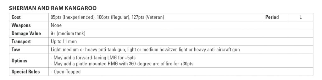 British players can also look forward to plenty of armoured transport options. The ‘Kangaroo’ ad-hoc APC selection has been expanded and revised to include Stuarts, Priests, and Rams, with the option for HMGs and LMGs adding even more versatility. The Guy Lizard armoured command vehicle also joins the gang, giving Britain access to a unique armoured transport without the Open-Topped rule, but with Command Vehicle, opening up a world of interesting tactical possibilities on the tabletop.