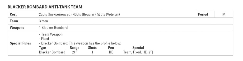 We’ll start with the Blacker Bombard! One of a clutch of unconventional weapons hastily developed by the British after Dunkirk to defend against the anticipated German invasion, this weird-looking spigot mortar (essentially a mortar without a traditional barrel, where the round fitted over a ‘spigot’ or spike instead of inside a tube) hurled a 20-pound high explosive shell that was theoretically supposed to stop German Panzers. While this seems unlikely, on the Bolt Action tabletop it’s actually quite a nifty little weapon against infantry. 40 points at Regular to chuck a 2” template at rifle range? Go on, then! It also has the added bonus of looking really peculiar, giving you the satisfaction of watching your opponents double-take when you deploy it. It’s been a staple of Armies of Great Britain over the years, and it proudly takes its place in Third Edition to sling HE with great enthusiasm and unusual mechanics.