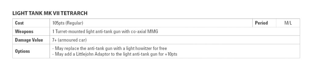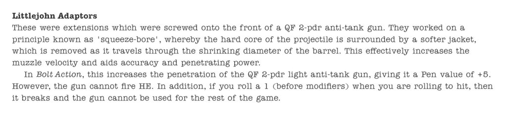 The most unusual thing about the Tetrarch (quite aside from the idea of a glider-borne tank!) is the ‘Littlejohn’ adaptor that many would be fitted with. This was an attempt to improve the anti-tank performance of the 2pdr gun, and operated on the ‘squeeze-bore’ principle, where the barrel actually narrowed down its length. While in real life it did work, it was a fragile device, and if broken would render the gun useless. Naturally, with something this cool, we had to have it in Bolt Action, and it’s been in since the beginning. The rules have been tweaked slightly for simplicity in Bolt Action: Third Edition, but a Tetrarch with a Littlejohn adaptor is actually a reasonably punchy little tank, for not very many points at all! The extra Pen value means it’s capable of taking on more heavily armoured foes than you’d expect, and the loss of the HE isn’t really that much of a hindrance. Take some shots at your opponent’s heavy armour, and confound them with engineering brilliance – just don’t roll a 1!