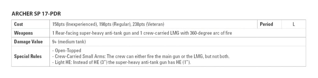 Now, in Bolt Action terms, it means that you’ve got a really powerful gun for not very many points (particularly with the new Light HE rule for the 17pdr) on a medium tank chassis, but one that requires some careful handling to mitigate the rear-facing gun. I really like the Archer as a unit that sits on Ambush until it’s needed to ruin an enemy tank’s day, but if you’re feeling really cheeky you can also drive it past your opponent’s vehicle, and then blast them in the rear armour from behind. It’s a bit bonkers – but it’s very British!