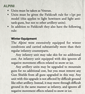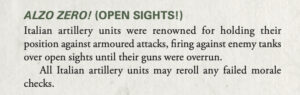 Veteran Italian players will tell you that in previous editions, they’ve had a bit of a tough time of things, with the infamous Avanti Savoia! rule swinging games wildly once bodies started dropping. We already gave Italians a boost in their PDF rules as part of removing the ‘negative’ special rules from the game, and the new book was a great opportunity to go back and completely re-evaluate how Italian forces work. Leading off, we’ve got two new rules that apply across the book: Alzo Zero! making your artillery more likely to literally stick to their guns, and Mixed Quality giving your Inexperienced units a nice little boost. Joining them is a revamped Defensive Strategy, letting you set up units in Ambush to start the game, and slowing your enemy down on the first turn.