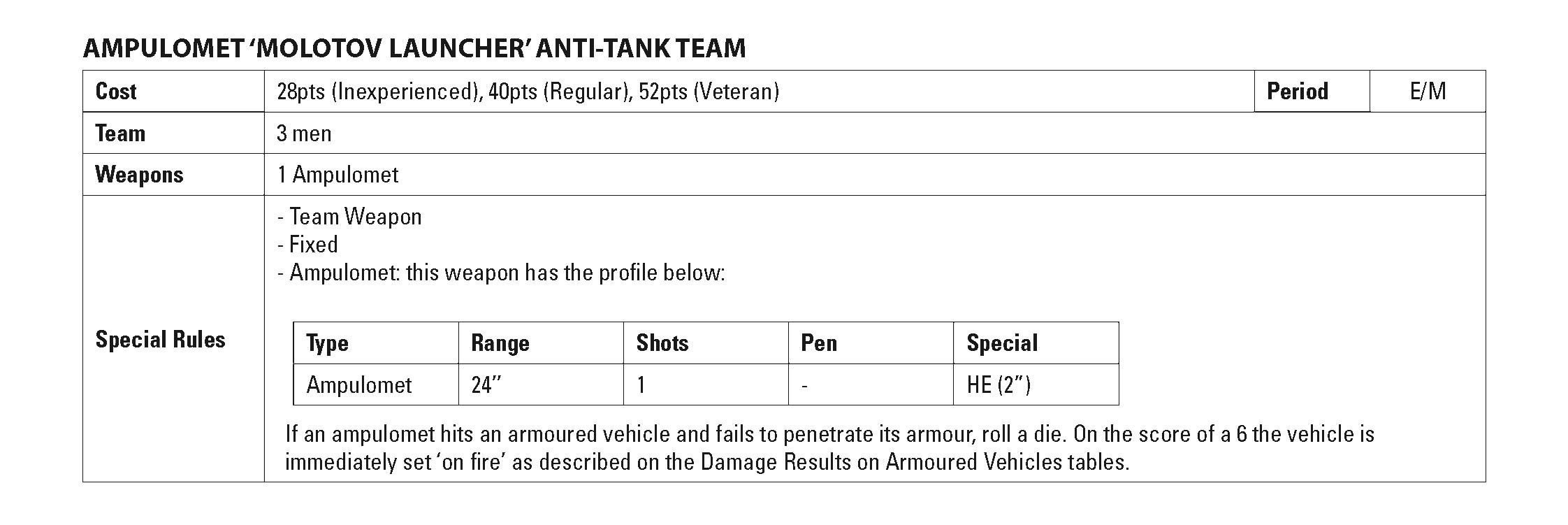 The Ampulomets is an unusual but surprisingly effective bit of kit on the tabletop. 40 points at Regular to chuck a 2” template out to 24” isn’t bad at all, but that’s all relatively ‘normal’. The ability to set a vehicle on fire with a 6, though? That’s just good fun! It doesn’t matter how big or small, if you get a hit and roll a 6 – that vehicle crew is taking that morale check, or running for the hills! The Ampulomets is arguably the best of the weird early or last-ditch anti-tank ‘guns’, and it looks suitably peculiar as well.