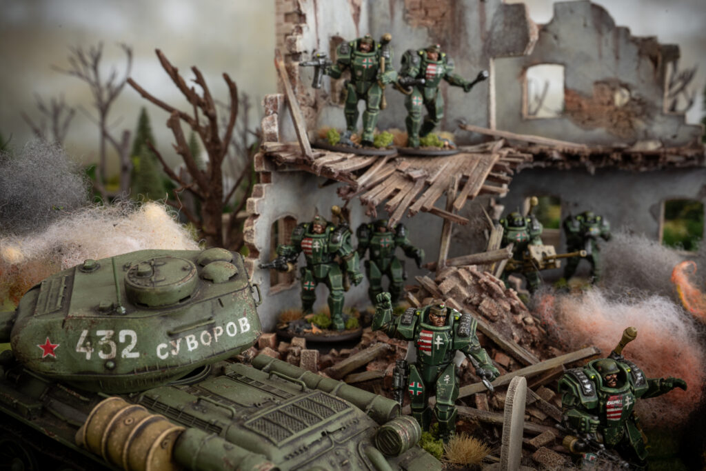 One particular painting technique I employed to speed things up a bit was to paint the Stahltruppen heavy infantry the same way I do vehicles. The vehicles and heavy infantry are sprayed a dark green as a primer, then a mid green from above, getting both the main colour applied and also some basic shading in minutes. I then drybrushed a light green over all the raised edges and rivets and used a sponge to do chipping damage with a very light green. After applying decals and painting any insignia, a gloss varnish coat is applied to protect all of this. The final stage that ties everything together is an oil wash of one part 50/50 burnt umber and black artist paint to nine parts white spirit. Paint all the green armour with this wash, then wipe the model down with a rag 20 minutes later. You end up with armour which is shaded and weathered in one go.