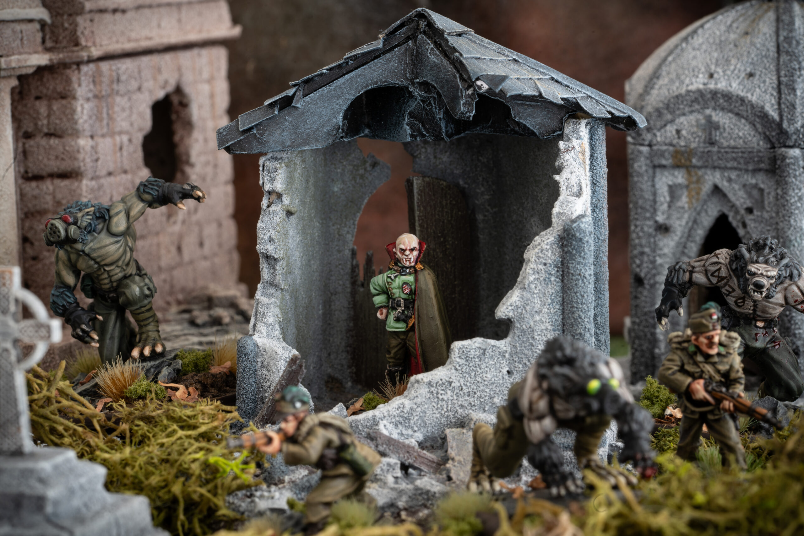 This is Kampfgruppe Carpathia, my Axis army for Konflikt ’47, in which I have chosen to focus on what a force of Hungarian troops might look like in this setting. The back story behind my army is this is a specialised force that operates in the Carpathian mountains, led by a nobleman from the region, Count Báthory. This impossibly ancient-looking and creepy officer brings with him packs of horrors from the forests – Shreckwulfen – as well as men from the villages to fill the ranks of the Border Guards.