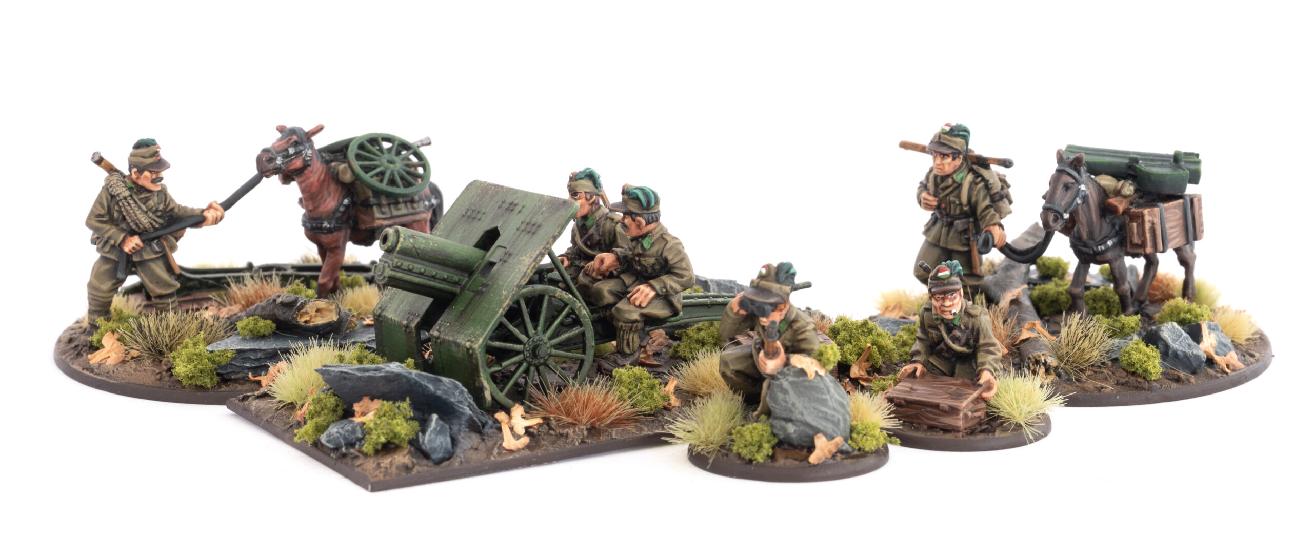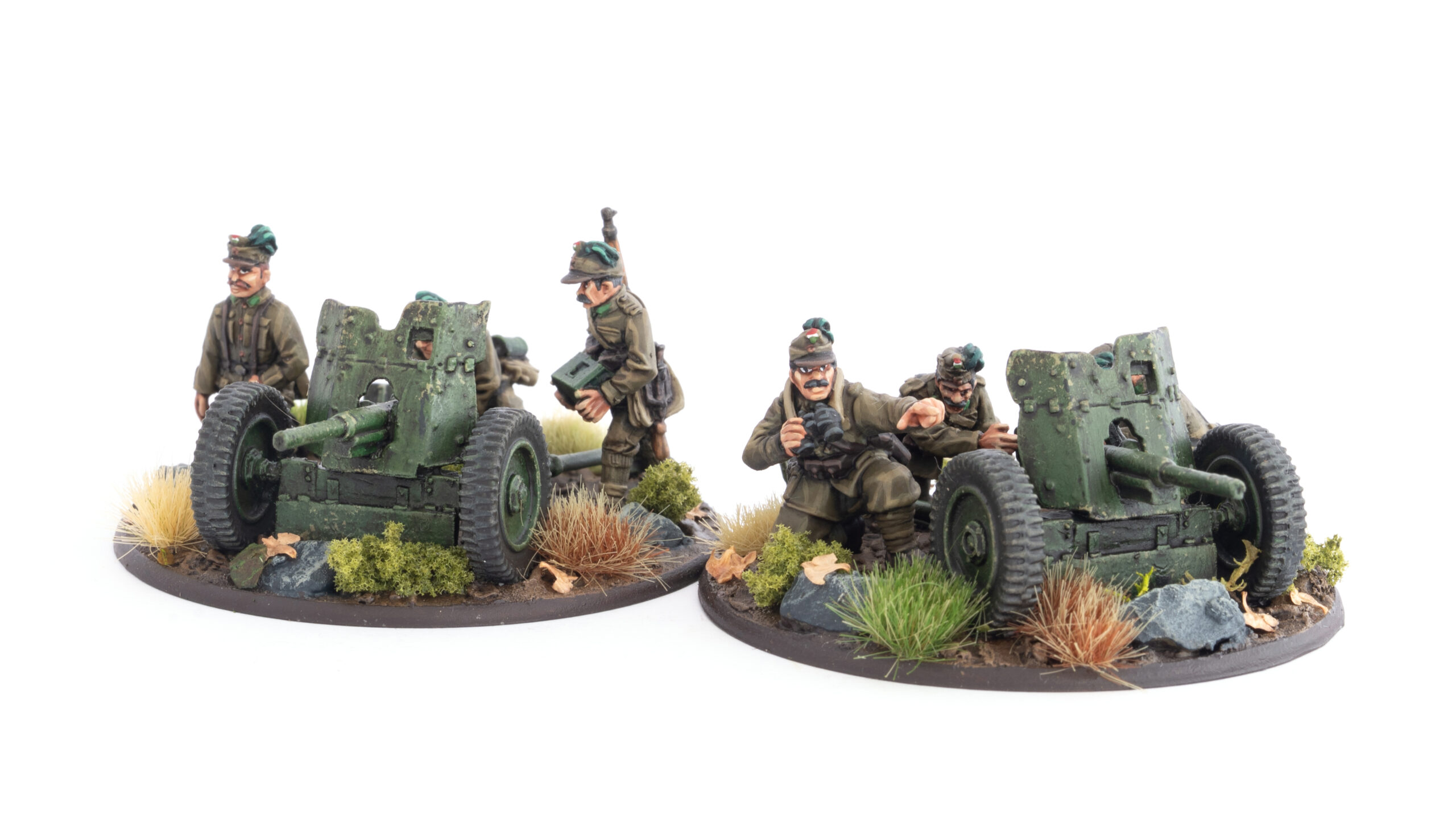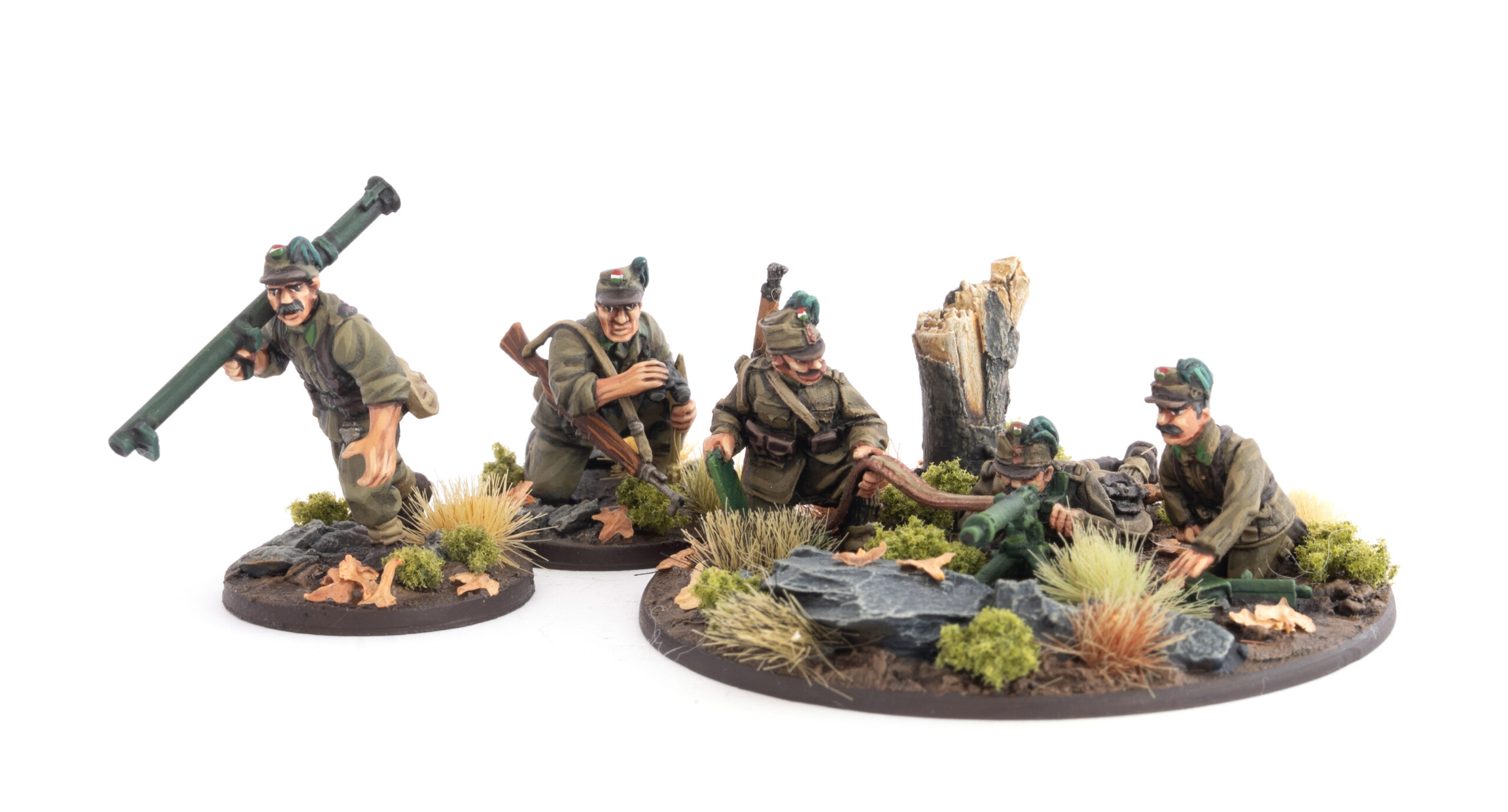 The basic infantry squads are all Border Guards and Mountain Infantry from the Bolt Action Hungarian range. To convert up the AT gun and weapon teams I converted Italian Alpini miniatures, mostly with just head swaps, taking plastic German heads with peaked caps and adding a moustache and feathered plume.