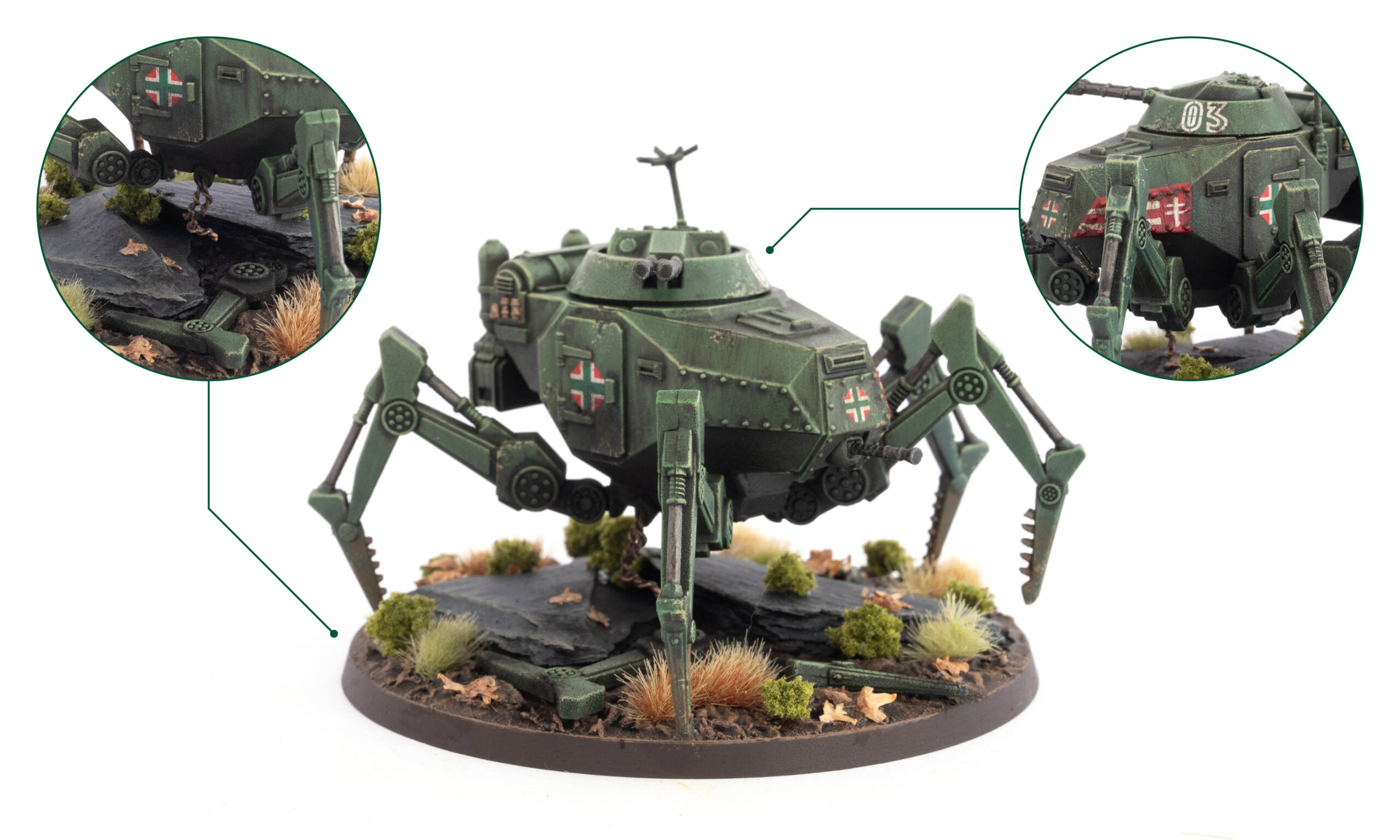 One of the miniatures in this army that offered a very fun modelling opportunity was the Vogelspinne. With its individual spider legs, you can make the miniature work with the basing in a very dynamic way. Informed by the army’s narrative that it is in the Carpathian mountains, I challenged myself to make the walkers scramble over dramatic irregular rocks and logs. This meant I had to make the bases first, then carefully glue each leg on while making sure they lined up with the shapes on the base, to create the scuttling effect. I used super glue to attach each of the legs with an instant bond so they lined up with the basing elements, rather than my normal plastic cement glue which takes longer to set. Tricky, but very fun!