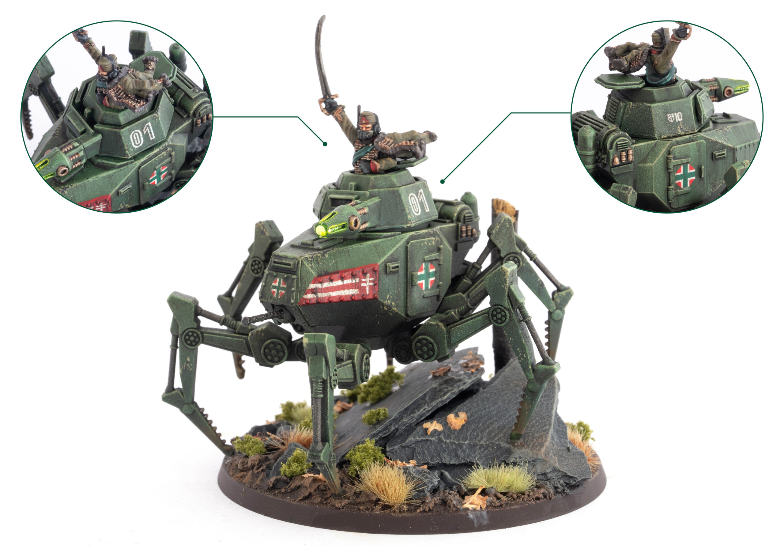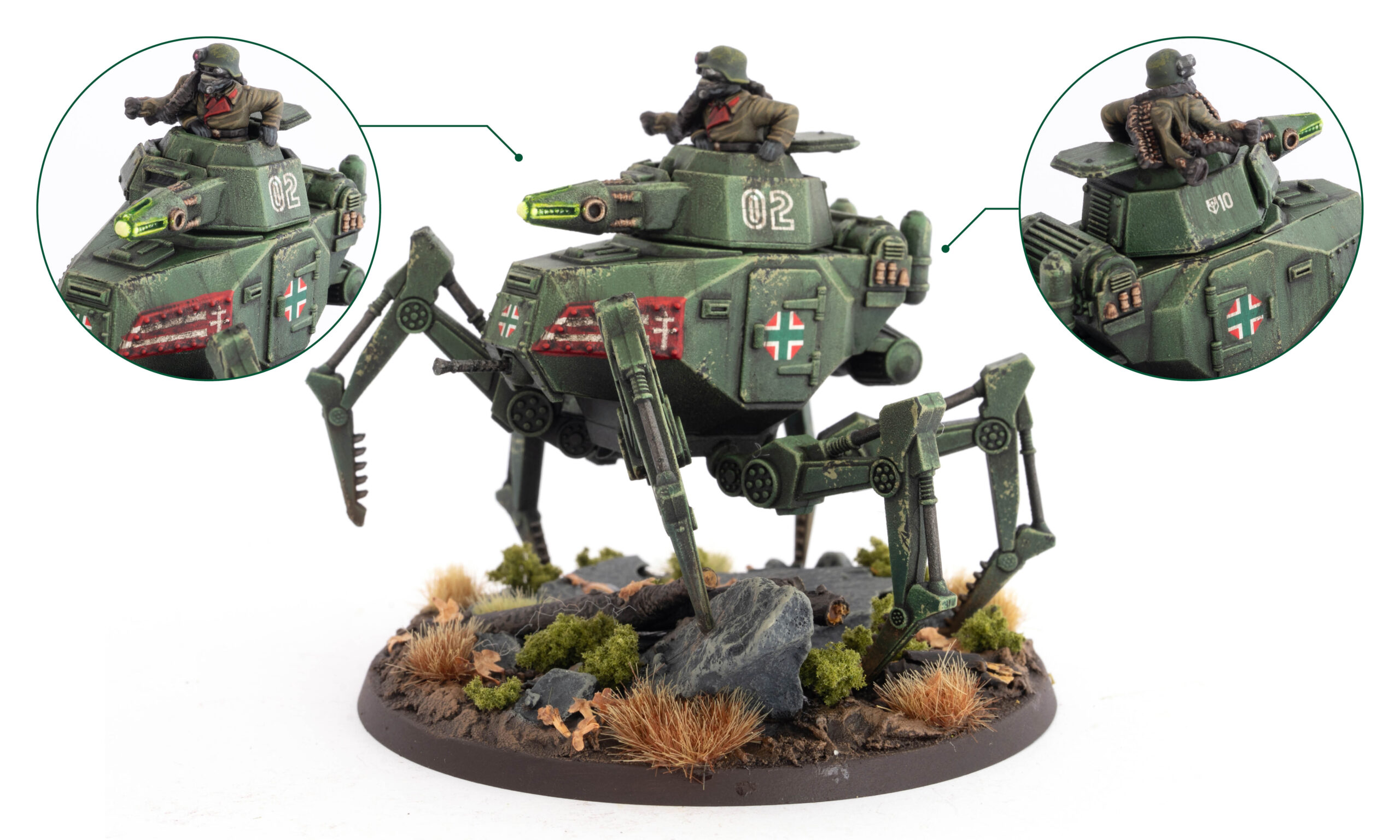 For the walker platoon I used three of the plastic Vogelspinne. It’s a lovely kit to assemble with very generous weapon options, you can assemble multiple full turrets with different weapons. To help tell the narrative of the army I imagined the walkers being a modern incarnation of the famous Hungarian cavalry, the Hussars. To achieve this in miniature was rather simple in the end, I used the plastic French Hussar sprue from the Napoleonic range to embellish the crew that comes in the Vogelspinne box. The platoon commander has a full Hussar body and pelisse (the very fetching short fur-trimmed jacket over the shoulder) combined with one of the three heads that comes in the Vogelspinne box.