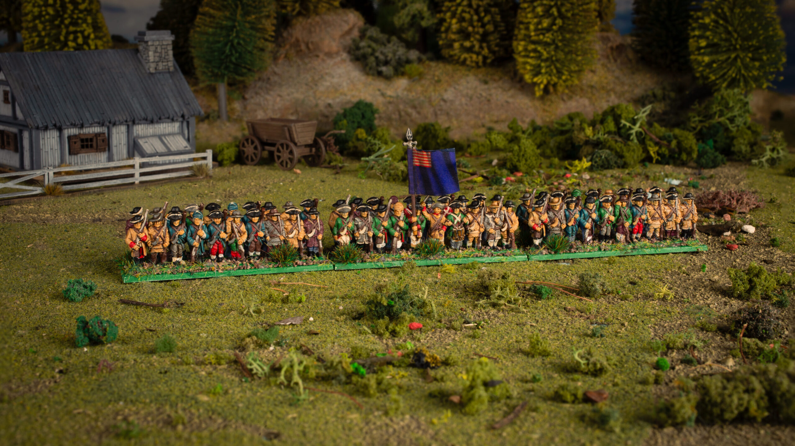 These Continental Militia are ready to rise against the British Crown! John has previously been working on some British forces for Black Powder Epic Battles: Revolution, and decided to change it up a bit. “Paint quickly and cheerfully” was his mantra here, and he enjoyed using almost his entire paintbox to produce a varied appearance, picking out the buckskins and linen hunting shirts. Getting the hats neat and tidy really brings this unit together, and with a change of flag they could just as easily be used as Loyalists!
