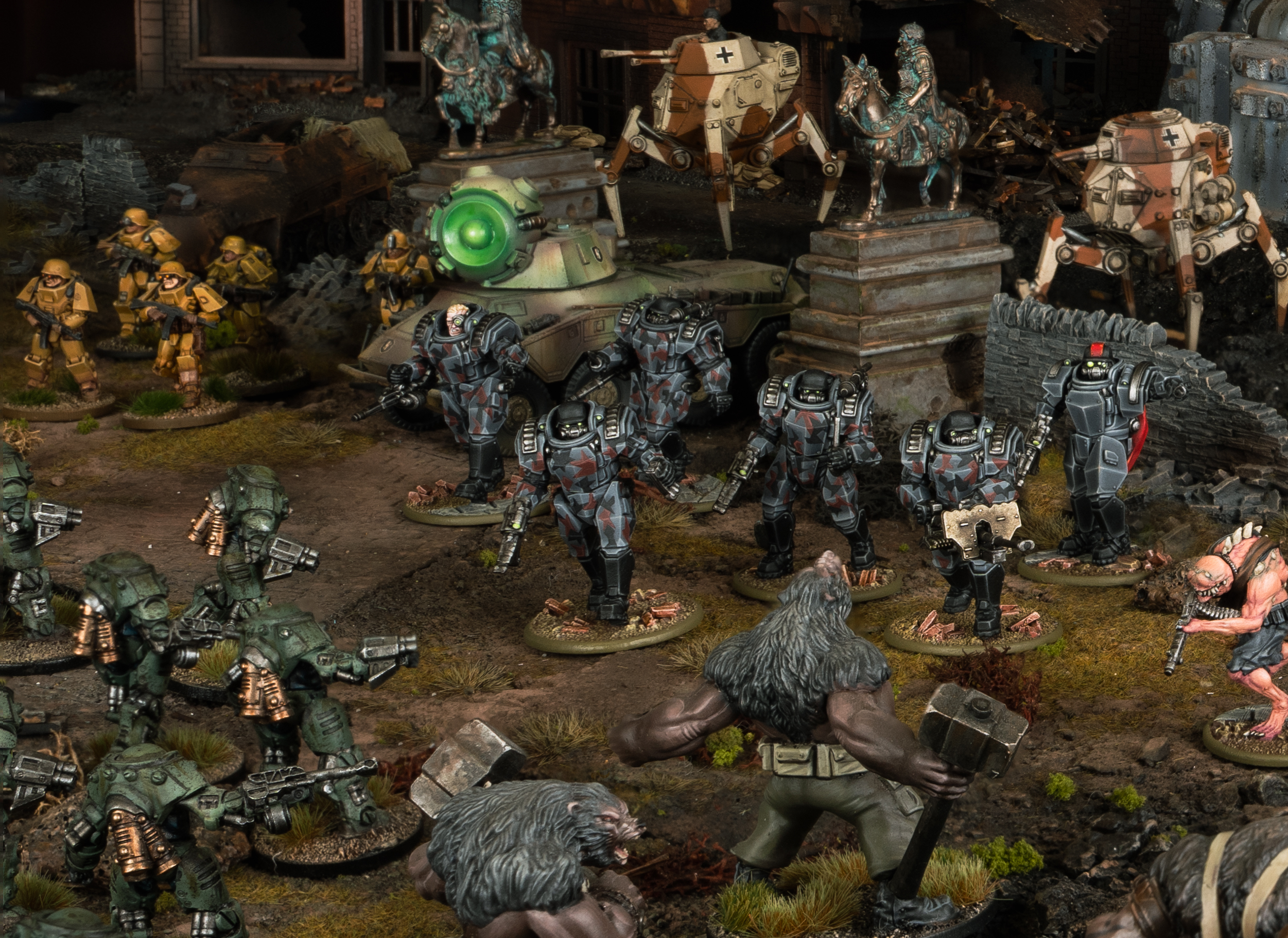 The initial combat deployment of the new troops, dubbed Stahltruppen, came in Poland in December 1946. Advancing Soviet forces, expecting to overrun what their intelligence had marked as an Axis artillery regimental HQ, were stunned by the appearance of the gargantuan heavy infantrymen instead. The Stahltruppen counterattacked from concealment in a wooded area, meeting a force of Soviet infantry head-on. The Soviets, veterans of the brutal Eastern Front, were annihilated in minutes, their weapons unable to do more than chip the paint of the massive armoured infantrymen. A follow-up attack by tanks was similarly destroyed, and the Soviet commander withdrew his forces, claiming the existence of a new ‘super-weapon’.