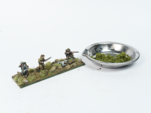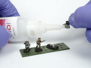 The first step in blending them into the groundwork is to use a texture paste. Products like this allow you to hide the integral base of the miniature completely, so that the ground sits flush with the figure’s feet. I apply it carefully with a brush, taking my time. It is very important not to get any of it onto the figures themselves.