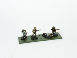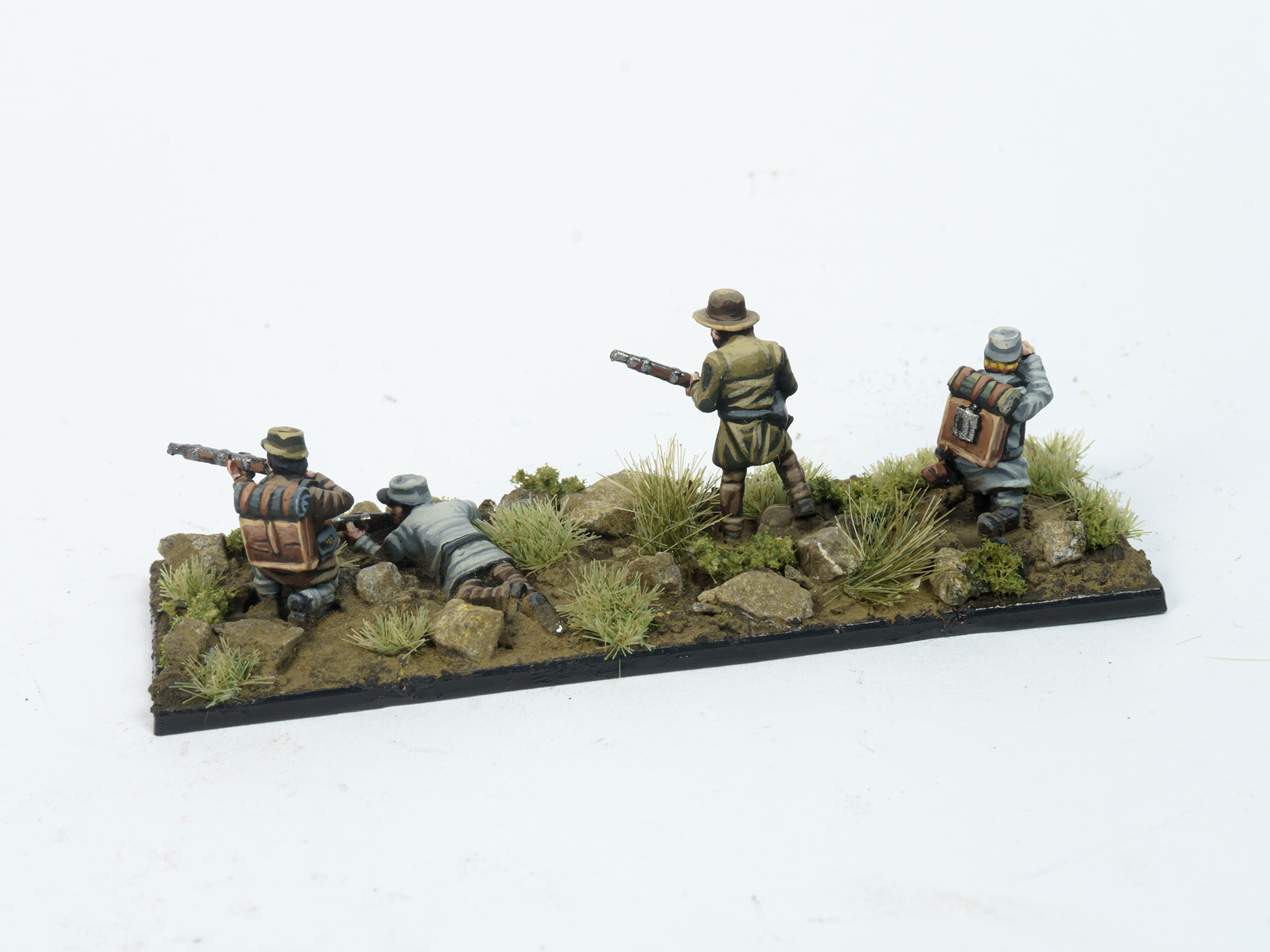 I always paint the figures separately and glue them to the base using superglue. I try to arrange them into a natural-looking scene and avoid having them project too far over the edges of the base.