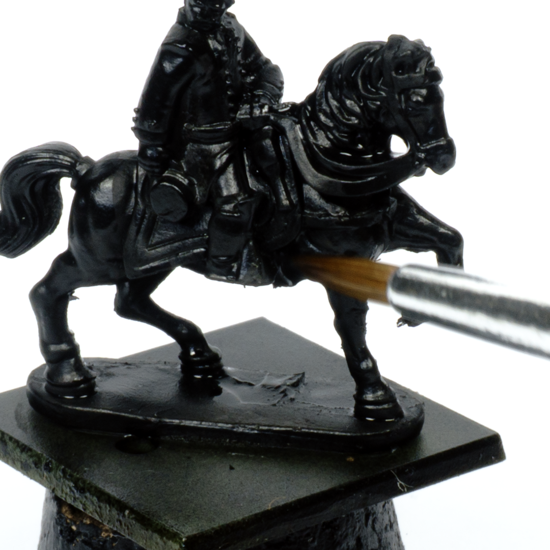 The first essential step is to use a black primer. This helps to disguise the deepest recesses, which are not always easy to reach with a brush. It saves time, and it also prevents any visible areas from being left in a pale or distracting colour. Before starting the paintwork, I always check the model carefully and touch up any spots where the primer has not covered properly. A brush and some black paint are all you need, but it is important to make sure there is no trace of the original material left visible .
