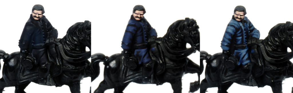 I use exactly the same method on the uniform. The shadow tone covers the whole garment, and if some areas are difficult to reach, that is not a problem, as the dark primer can remain visible in the deepest recesses. The mid-tone is used to define the folds of the cloth, especially on the shoulders and upper chest. Then the highlight is applied to those same raised areas to push the contrast a little further. At this scale, it is very important to be careful with colour choice, as tones that are too light can make the uniform stop reading as a dark blue altogether.