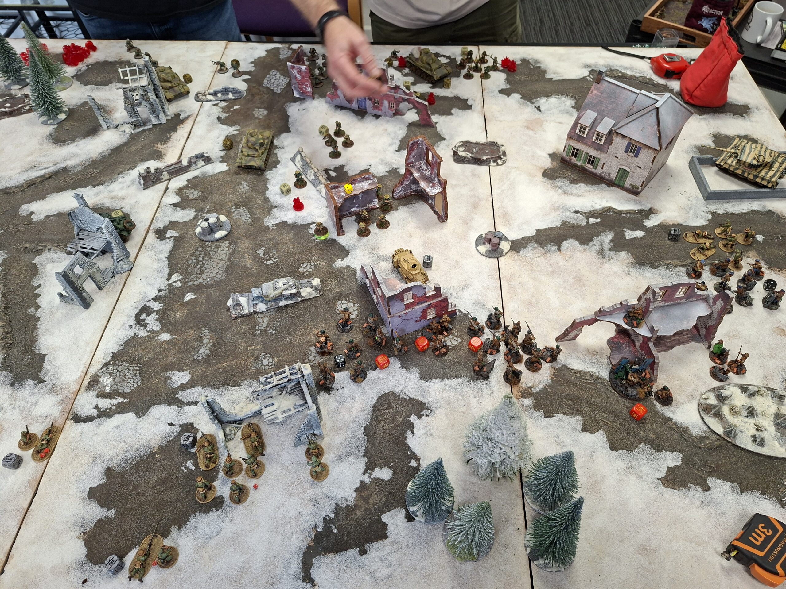 Having drawn the first game, we felt sure we’d dropped any chance of placing at the top end of the standings, and in hindsight this probably meant we played our second game much more freely. We matched up against Martin Fairweather and James Leahy, who’d brought a pair of German lists – one early-war SS, packed with Veterans and light armour, and one Afrika Korps, including a rather concerning Flak 88.